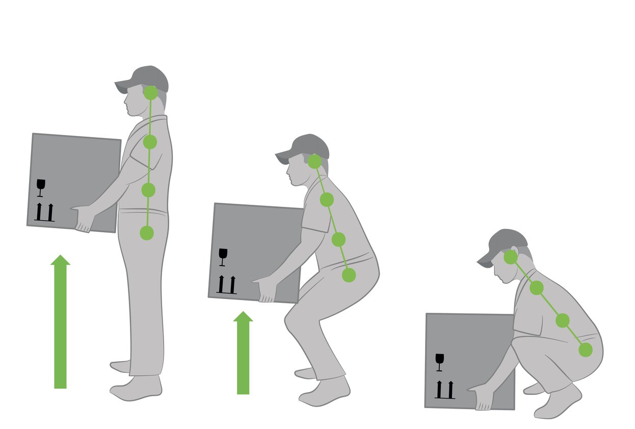 One of the most common types of injury is lower back pain, most likely due to heavy lifting of materials and machinery which is something that can be reduced by using the correct lifting techniques (see figure below) or asking for help on items that are difficult to carry properly on your own.